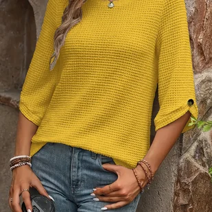 TEMU Stylowa Bluzka Damska z 3/4 Rękawem - Luźny Krój, Okrągły Dekolt, Jednokolorowa z Ozdobnymi Guzikami, Elastyczna Tkanina, Pranie Maszynowe, Na