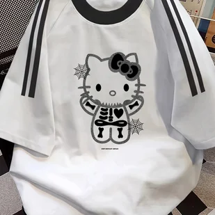 TEMU T-shirt z nadrukiem kotka i pajęczego sznura - swobodny top z okrągłym dekoltem, kolorowy top dla kobiet, kolekcja wiosna/leto, biały z