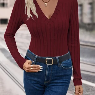 TEMU Wiosenno-jesienna damska bluzka z dekoltem w serek, jednokolorowa, prążkowana, casualowa, długi rękaw