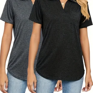TEMU Zestaw 2 sztuk Damskich Koszulek z Dekoltem w Serek i Krótkim Rękawem - Luźne, Jednokolorowe Bluzki z Kieszeniami na Piersi, Możliwość Prania w