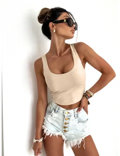 Top bluzka bokserka SILVERO - beżowa Klasyczna bokserka z głębokim dekoltem to miła odmiana na lato. Materiał jest elastyczny, dzięki czemu idealnie dopasowuje się do sylwetki. Taki top jest idealną bazą pod wiele różnych stylizacji. Świetnie prezentuje się z krótkimi szortami i trampkami. Równie pięknie i romantycznie będzie się prezentować w zestawie z długą, szyfonową spódnicą i modnymi espadrylami.