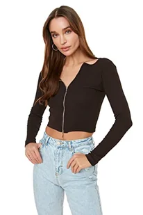 TRENDYOL Bluzka damska z okrągłym dekoltem, jednokolorowa, krój, brązowy, L