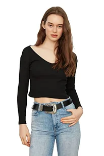 TRENDYOL Damska bluzka z dekoltem w serek, jednokolorowa, podkreślająca figurę, Black And White, L