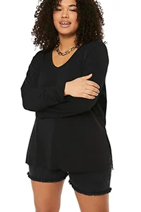 TRENDYOL Damska bluzka z dekoltem w serek, jednokolorowa, regularne rozmiary, czarny, 46