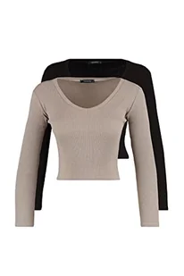 Trendyol Damska dopasowana bluzka z dzianiny z dekoltem w serek, Beżowy/brązowy, XS