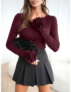 Wiskozowa bluzka z różą na rękawie ELIJA - bordowa Ta wyjątkowa bluzka to połączenie klasyki z nowoczesnym, kobiecym detalem, który przyciąga uwagę od pierwszego spojrzenia. Wykonana z miękkiej, oddychającej wiskozy, gwarantuje komfort noszenia i perfekcyjnie układa się na sylwetce. Największym atutem modelu są długie rękawy z ozdobną różą, które dodają całości oryginalnego charakteru i tworzą efekt prawdziwej elegancji. Subtelnie dopasowany fason podkreśla talię, jednocześnie zapewniając swobodę ruchów. To element garderoby, który świetnie sprawdzi się zarówno na co dzień, jak i na wyjątkowe okazje.
