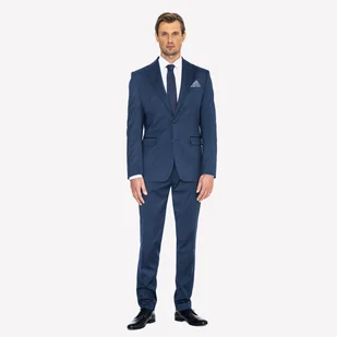 Stylowy granatowy garnitur w biały prążek. Krój slim fit podkreśla proporcje sylwetki. Marynarka jednorzędowa zapinana na dwa guziki. Spodnie lekko zwężane. Garnitur uszyto z wysokiej jakości materiałów.