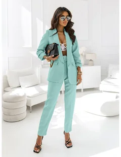 Modny garnitur marynarka i spodnie NAJAT - light blue Postaw na styl, który zachwyca klasą i nowoczesnym charakterem – elegancki komplet garniturowy w delikatnym odcieniu light blue to must-have każdej modnej kobiety. Dopasowana marynarka o przedłużonym kroju z klapami i kieszeniami świetnie podkreśla sylwetkę, a spodnie z wysokim stanem i paskiem pięknie modelują talię. Całość prezentuje się niezwykle szykownie, a jednocześnie pozwala na pełną swobodę ruchów – idealna propozycja na spotkania biznesowe, ważne wydarzenia lub stylowy lunch z przyjaciółkami. Możesz nosić go klasycznie – z elegancką koszulą i szpilkami, lub przełamać stylizację zmysłowym topem lub koronkową bielizną, jak na zdjęciu, tworząc modowy, odważny look. Zestaw świetnie komponuje się z dodatkami w kolorze czerni lub złota – postaw na lakierowaną torebkę, sandałki na obcasie i biżuterię XXL.