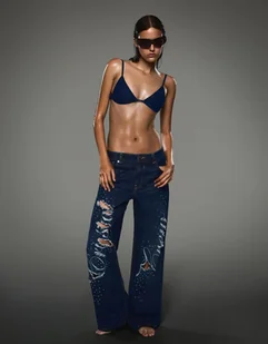 Bershka Jeansy O Kroju Baggy Z Laserowym Nadrukiem Edycja Limitowana Kobieta 40 Niebieski