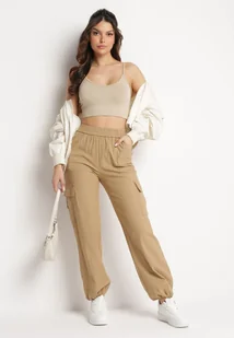 Beżowe Bawełniane Bojówki z Naszytymi Kieszeniami i Ściągaczami Spodnie Rinea