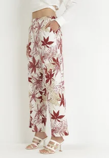 Beżowo-Czerwone Szerokie Spodnie z Wysokim Stanem i Gumką w Pasie w Bawełny Eliphne