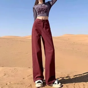 Bordowe jeansy damskie z prostą nogawka - Bordowy