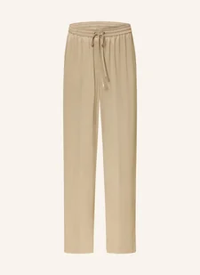 Wysoki stan. Szerokie, proste nogawki. Elastyczny pas w talii z tunelem z troczkiem. Kanty. Boczne kieszenie wpuszczane. Materiał gładki w dotyku. Materiał satynowy