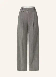 Wysoki stan. Proste, szerokie nogawki. Zapięcie na zamek błyskawiczny i haftki. Kanty i zakładki. Boczne kieszenie wpuszczane.