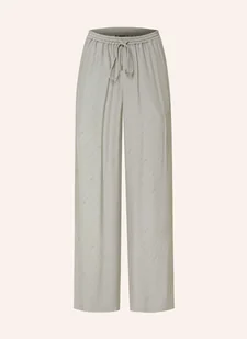 Wysoki stan. Proste nogawki. Elastyczny pas w talii z tunelem z troczkiem. Boczne kieszenie wpuszczane. Nadruk z marką na całej powierzchni. Lejący materiał