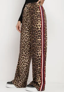 Brązowo-Czerwone Szerokie Spodnie w Panterkę z Wiskozą i Gumką w Talii Ozdobione Lampasami Velonara