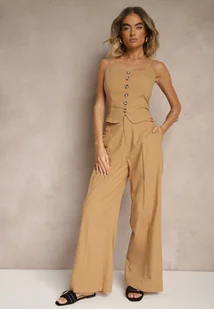 Ciemnobeżowe Spodnie z Bawełną i Wiskozą o Szerokim Kroju z Imitacją Kieszeni Divlene