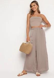 Ciemnobeżowe Szerokie Spodnie z Wiskozy z Wysokim Stanem Rissalie
