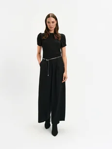 Eleganckie czarne spodnie typu wide leg to doskonały wybór dla kobiet ceniących zarówno styl, jak i komfort. Wykonane z mieszanki materiałów, zapewniają swobodę ruchów i doskonale układają się na sylwetce. Ich klasyczny czarny kolor dodaje uniwersalności, pozwalając na łatwe zestawianie z różnymi elementami garderoby. Idealne do eleganckich stylizacji czy codziennych, bardziej casualowych zestawień, czarne spodnie wide leg stanowią niezbędny element każdej kobiecej szafy.