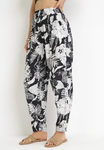 Czarne Spodnie z Gumką w Pasie z Wiskozy w Roślinny Print Daffodi