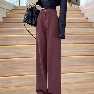 CECHY PRODUKTU: Spodnie jeansowe Kolor spranego bordo Prosta nogawka Wysoki stan