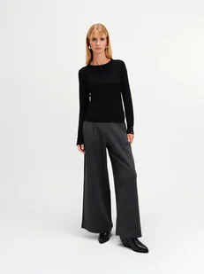 Eleganckie, dzianinowe spodnie w szarym kolorze z szeroką nogawką z subtelnymi zakładkami, które nadają fasonowi lekkości i modowego charakteru.