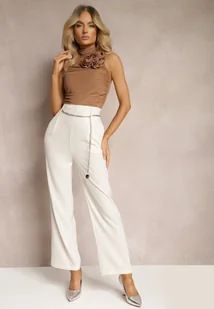 Jasnobeżowe Eleganckie Spodnie z Rozszerzanymi Nogawkami Wykończone Ozdobnym Łańcuszkiem w Pasie Hamophona