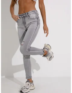 Jeansowe spodnie push up z przetarciami MINSY - szare Jeansowe rurki push up w szarym odcieniu z modnymi przetarciami to idealny wybór na sezon wiosna 2025 i spodnie do zadań specjalnych! Wykonane z elastycznego materiału, zapewniają nie tylko świetny wygląd, ale również wygodę noszenia przez cały dzień. Stylizuj je z krótkim topem i sneakersami na codzienne wyjścia lub z elegancką koszulą i botkami na obcasie, aby stworzyć bardziej wyrafinowany look. Podwijane nogawki dodają nonszalancji i doskonale pasują do lekkich wiosennych stylizacji. Uniwersalny kolor świetnie komponuje się z pastelami, jak i mocniejszymi akcentami. Te szare jeansy to must-have w szafie każdej miłośniczki nowoczesnych i wygodnych outfitów.