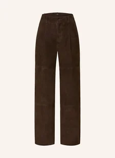 Wysoki stan. Proste nogawki. Zapięcie na guziki i zamek błyskawiczny. Zakładki. Boczne kieszenie wpuszczane. Ozdobne kieszenie z wypustką. Miękki w dotyku materiał. Czysta skóra