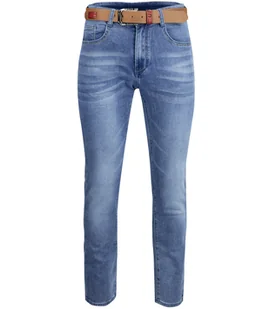 męskie jeansy klasyczny fason 5 kieszeni niebieski kolor z brązowym paskiem Klasyczne jeansy męskie w kolorze niebieskim Zapinane na guzik i suwak Stan stand...