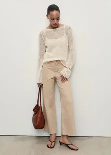Tkanina bawełniana w stylu jeansowym, Tkanina elastyczna, Fason culotte, Ankle brace, Wysoki stan, Szlufki, Tylne kieszenie, Zapięcie na zamek błyskawiczny i guzik, Postrzępione nogawki, Długość wewnętrzna 72 cm, Dostępne Plus, Dwie kieszenie z tyłu, Modelka ma 179 cm wzrostu i nosi rozmiar S/36