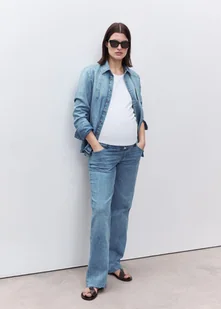 Tkanina bawełniana w stylu jeansowym, Fason wideleg, Długi krój, Niski stan, Szlufki, Pięć kieszeni, Elastyczny pas z dzianiny w talii dla lepszego podtrzymania i komfortu, Bez zapięcia, Ozdobny guzik, Długość wewnętrzna 78 cm, Polecamy kupić zwyczajowy rozmiar, Zapewnia komfort i swobodę ruchu, Odzież ciążowa, Modelka ma 178 cm wzrostu i nosi rozmiar S/36, Elastyczna gumka, Szeroka cholewka, Elastyczna talia, Wyłącznie online