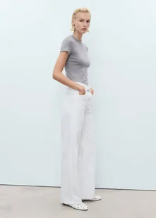 Długi fason, Krój wideleg, Wysoki stan, Szlufki, Pięć kieszeni, Postrzępione nogawki, Zapięcie na zamek błyskawiczny i guzik, Długość wewnętrzna 84,5 cm, Tkanina bawełniana w stylu jeansowym, Szeroka cholewka, Zapięcie na zamek i guzik z przodu
