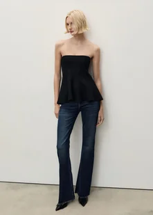 Tkanina bawełniana w stylu jeansowym, Miękki denim, Długi krój, Styl flare, Średni stan, Szlufki, Pięć kieszeni, Postrzępione nogawki, Pełna długość, Zapięcie na zamek i guzik z przodu, Dostępne Plus, Długość wewnętrzna 83 cm, Modelka ma 179 cm wzrostu i nosi rozmiar S/36