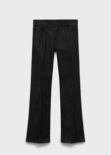 Tkanina bawełniana w stylu jeansowym, Długi fason, Styl flare, Średni stan, Szlufki, Pięć kieszeni, Zapięcie z przodu na guzik, haftkę i zamek kryte pod listwą