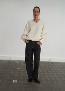 Tkanina bawełniana w stylu jeansowym, Długi fason, Prosty krój, Średni stan, Szlufki, Sześć kieszeni, Zapięcie na guziki, Kolekcja Selection