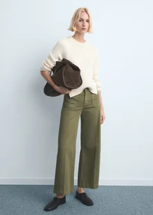 Tkanina bawełniana w stylu jeansowym, Długi fason, Krój wide leg, Wysoki stan, Szlufki, Dwie kieszenie naszywane z przodu, Zapięcie na zamek i guzik z przodu