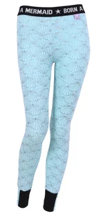 < Miętowe, dopasowane legginsy we wzór muszelek. W pasie czarna, szeroka gumka, z napisem "Born a mermaid". Nogawki wykończone ściągaczami. Wykonane z wysoki...
