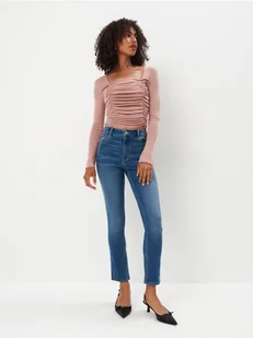 Jeansy o kroju slim z ozdobnymi elementami na tylnej kieszeni. Posiadają zapięcie na zamek i guzik.