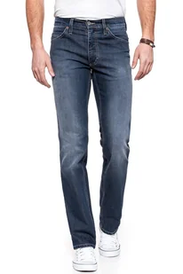 męskie spodnie jeansowe w granatowym, delikatnie wycieranym odcieniu model ten charakteryzuje dopasowany krój, średni stan oraz lekko zwężana nogawka na tyln...
