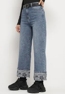 Niebieskie Jeansy z Szerokimi Nogawkami Wywiniętymi u Dołu z Ozdobnym Wzorem i Paskiem Xaloma
