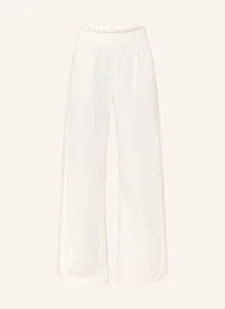 Wysoki stan. Proste nogawki. Elastyczny pas w talii z tunelem z troczkiem. Boczne kieszenie wpuszczane. Haft z logo z boku. Splot skośny. Solidny w dotyku materiał