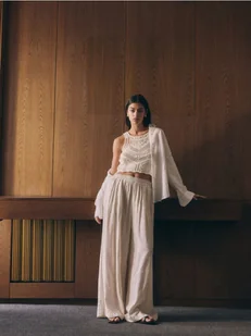 Spodnie o swobodnym fasonie, uszyte z tkaniny z wiskozą i domieszką lnu oraz bawełny.
