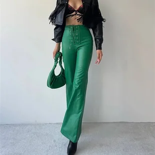 Rozszerzane spodnie damskie z ekoskóry - Zielony