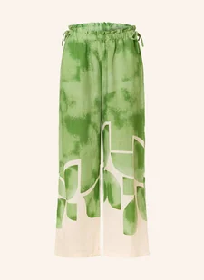 Wysoki stan. Proste, szerokie nogawki. Elastyczny pas w talii z tunelem z troczkiem. Boczne kieszenie wpuszczane. Nadruk na całej powierzchni. Lekka bawełna