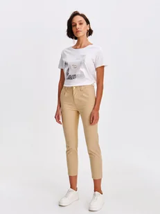 Spodnie damskie Top Secret o długości 7/8. Spodnie damskie ze zwężanymi nogawkami o długości 7/8. Są one zapinane z przodu na guzik oraz suwak, posiadając szlufki do założenia paska w talii oraz praktyczne kieszenie po bokach. Spodnie typu chinosy wykonane zostały z delikatnej oraz przyjemnej w dotyku tkaniny bawełnianej, przylegają do kobiecej sylwetki i eksponują jej walory. Idealnie uzupełnią one praktycznie każdy kobiecy pomysł stylizacyjny w okresie wiosennym oraz letnim.