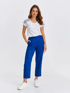 Spodnie damskie Top Secret o pełnym prostoty kroju. Spodnie damskie o prostym luźnym kroju z nogawkami o długości przed kostkę, zakończonymi u dołu efektownym podwinięciem. Są one zapinane z przodu na guzik oraz suwak, a uroku dodają im praktyczne kieszenie po bokach oraz delikatne zaszewki na wysokości bioder. Zostały one wykonane z przyjemnej w dotyku oraz dobrej gatunkowo tkaniny wiskozowej, będąc świetnym uzupełnieniem dla praktycznie każdej kobiecej stylizacji letniej oraz wakacyjnej. Spodnie dostępne w kolorze niebieskim SSP4411NI.