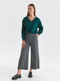 Spodnie damskie Top Secret z szerokimi nogawkami. Eleganckie i pełne niepowtarzalnego wdzięku spodnie damskie o długości 7/8 z bardzo efektownymi szerokimi nogawkami. Są one zapinane z przodu na guzik i suwak, a po bokach posiadają praktyczne kieszenie, będąc wzbogaconymi o niebywale efektowny wzór retro na całości. Świetnie komponują się one zarówno z elegancką bluzką, jak i nieco mniej formalnym sweterkiem, będąc odpowiednim wyborem praktycznie dla każdej stylizacji oficjalnej i eleganckiej. Spodnie dostępne w kolorze szarym SSP4177SZ. Modelka ma 177 cm wzrostu i prezentuje rozmiar 34.