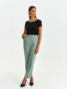 Spodnie damskie Top Secret proste tkaninowe. Proste tkaninowe spodnie damskie o długości do kostek z praktyczną gumką w talii. Posiadają one kieszenie po bokach wzbogacone ozdobnymi guzikami po ich zewnętrznej stronie i wykonane zostały z przyjemnej w dotyku i trwałej tkaniny. Świetnie sprawdzają się one jako element stylizacji oficjalnej i wyjściowej, będąc cenionymi za oferowany nienaganny styl oraz niepowtarzalną elegancję. Spodnie dostępne w kolorze zielonym SSP4246ZI.