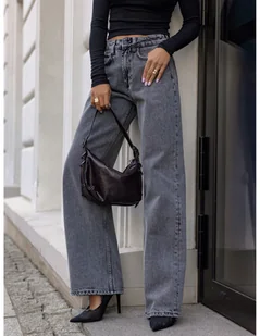 Spodnie jeansowe z szeroką nogawką LIZA - szare Te spodnie to must-have w każdej szafie, który łączy wygodę z modnym wyglądem. Ich szeroki krój w stylu oversize podkreśla sylwetkę, a ciemnoszary odcień dodaje charakteru każdej stylizacji. Wysoki stan idealnie modeluje talię, a surowe wykończenie nogawek wprowadza nonszalancki akcent. Te jeansy sprawdzą się zarówno na co dzień, jak i w bardziej eleganckich stylizacjach. Połącz spodnie z dopasowanym crop topem i sneakersami, aby stworzyć codzienną stylizację idealną na zakupy czy spacer po mieście.